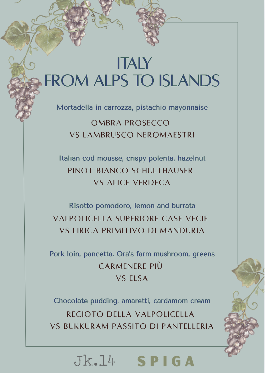 An intimate wine dinner inspired by Italy’s breathtaking diversity — from cool alpine vineyards to sun-drenched southern shores, with a few central gems in between.